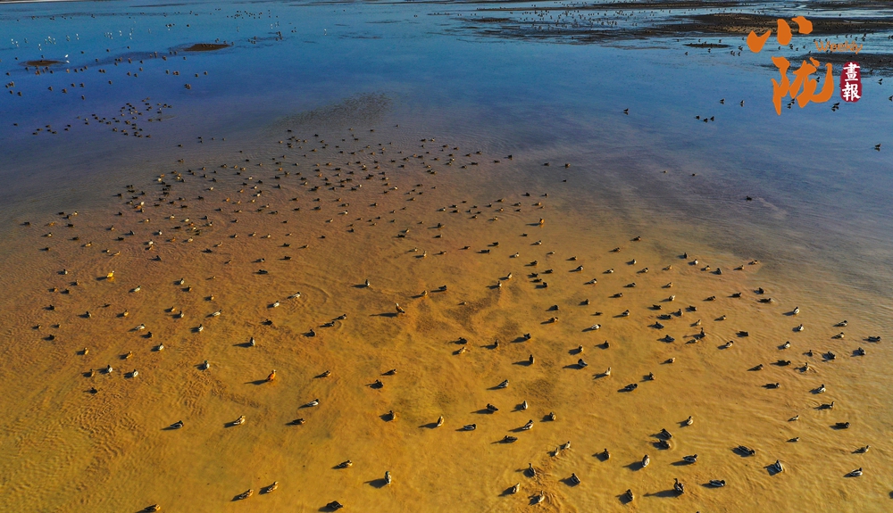 陽光照射下,鹽沼像是一片白色的海洋,湖面波光粼粼。成千上萬只赤麻鴨,在這里停歇覓食,它們或在水中嬉戲打鬧,或在空中振翅飛翔,繪成了一幅秋日美景。