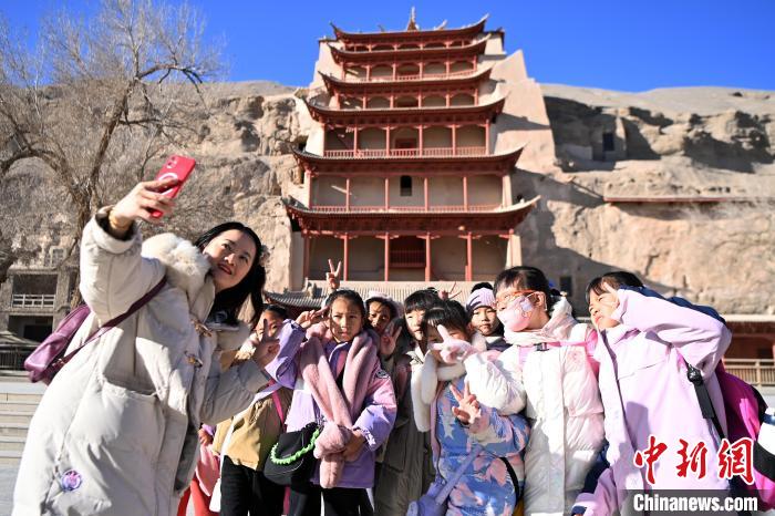 敦煌文化研學(xué)正逐步成為敦煌旅游新時(shí)尚,莫高窟成為“研學(xué)養(yǎng)身養(yǎng)心”的學(xué)堂之一。連日來(lái),中新社記者來(lái)到冬日的莫高窟,沒(méi)有了夏日的人聲鼎沸和如長(zhǎng)龍的隊(duì)伍,多了更多青春面孔,穿著絢麗服飾、背著書包的學(xué)生,點(diǎn)綴著沉悶的戈壁土黃色。