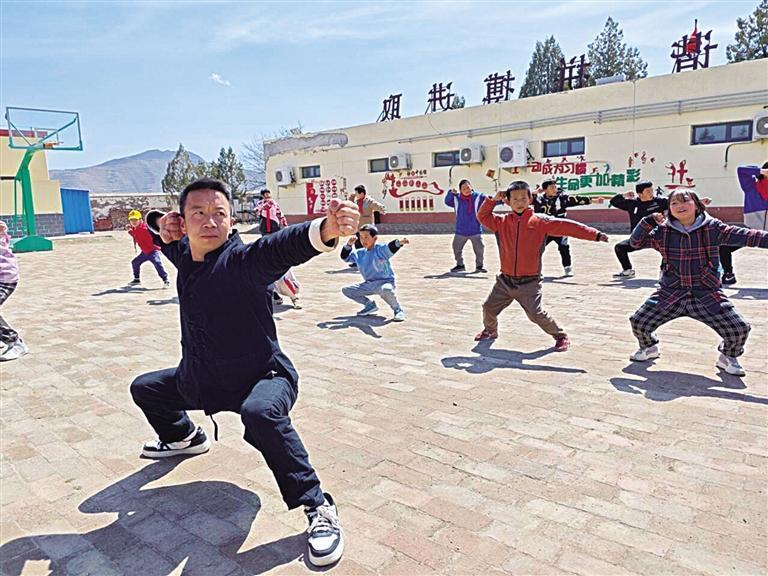 在晏家洼小學(xué),記者看到,山頂?shù)年柟馀c風(fēng)里,17個(gè)孩子整整齊齊地站在操場上,在陳偉禮的帶領(lǐng)下,有模有樣地練起來。弓步,出拳,眼神凌厲,撤腿,下蹲,身體下壓,此刻的孩子們像一只只努力展翅的雛鷹。