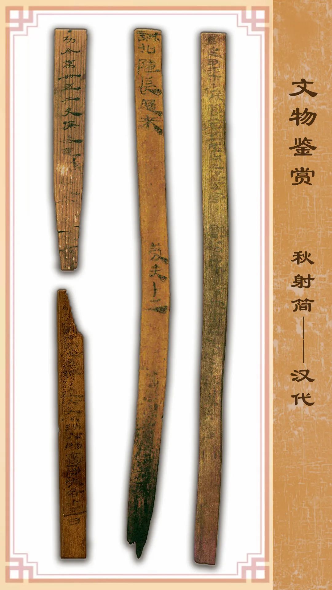 這是漢代邊塞有關“秋射”的一組散簡(出土編號分別為:EPT52:95、EPT53:34/41、EPT11:1),都是一行書寫。1974年出土于甲渠候官遺址。其中一枚簡(EPT53:34)是關于邊塞軍官秋射考核的令文;兩枚簡(EPT52:95、EPT53:41)是秋射考核記錄;簡EPT11:1記錄了秋射賜勞的規(guī)定。