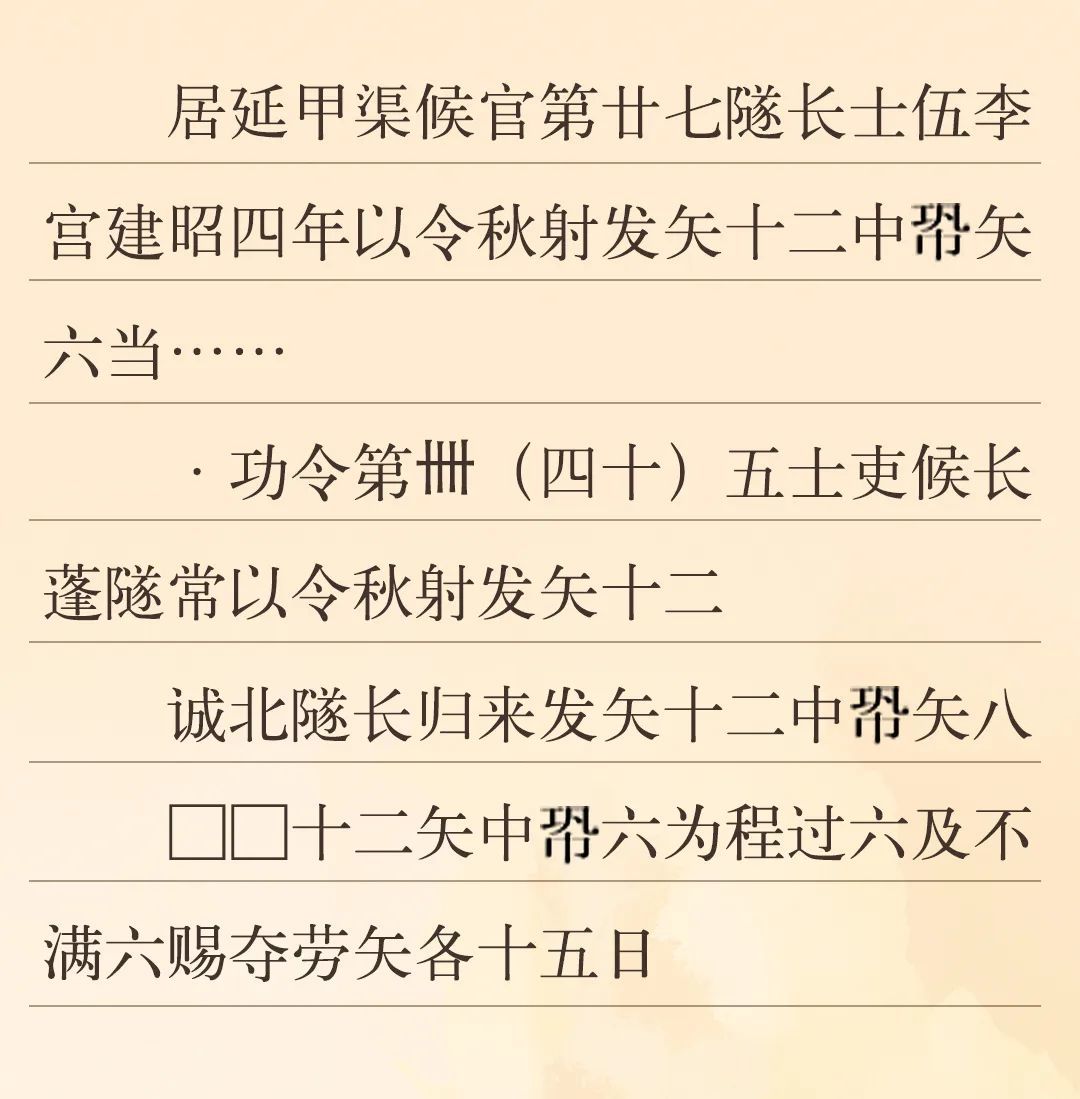 漢代對于官吏的考核分為文職和武職。文職主要考核書寫能力、治理能力、財務能力、法律能力等;武職考核主要是一年一度的射箭考核,因為在秋季舉行,故稱為“秋射”,發(fā)十二箭,中六箭為合格(即“中程”)。河西邊塞的官府通過秋射這一活動,借以考察和檢驗邊塞吏員們的軍事技術水平,并以此作為賜勞和奪勞的依據(jù)。為了提高吏員們的射箭技術,邊塞官府還派專人來管理訓練吏卒。邊塞參加秋射的主要是烽燧的燧長、部塞的候長、候官的候等吏員。