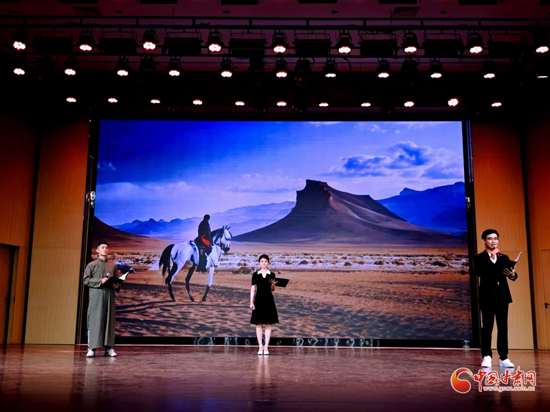 詩朗誦環(huán)節(jié)選取了著名詩人昌耀的《在敦煌名勝地聽駝鈴尋唐夢》、葉舟的《大唐西域記》、汪小平的《蘭州、別樣的城市》以及項(xiàng)目主持人徐兆壽的《尋找昆侖》《敦煌之光》等。這些作品都取材自絲綢之路,學(xué)員們以詩歌朗誦的形式,抒發(fā)了詩人對絲綢之路的贊美之情,展現(xiàn)了絲綢之路的壯麗景色和豐厚的歷史文化內(nèi)涵,仿佛令人置身于充滿傳奇色彩的古道。最后,全體學(xué)員與舞蹈演員合唱歌曲《等你在涼州》,將演出推向了高潮。