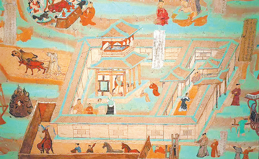 如莫高窟北魏第257窟“須摩提女緣品”圖中宅院的三面就有城垣圍繞,一側(cè)有門樓,院內(nèi)有堂,堂后有四層望樓,樓后有園,墻頂雙線,代表土墻上加筑的女墻。宅第的墻垣上有突出并高于城垣的墩臺(tái)顯示出城墻的防御功能。