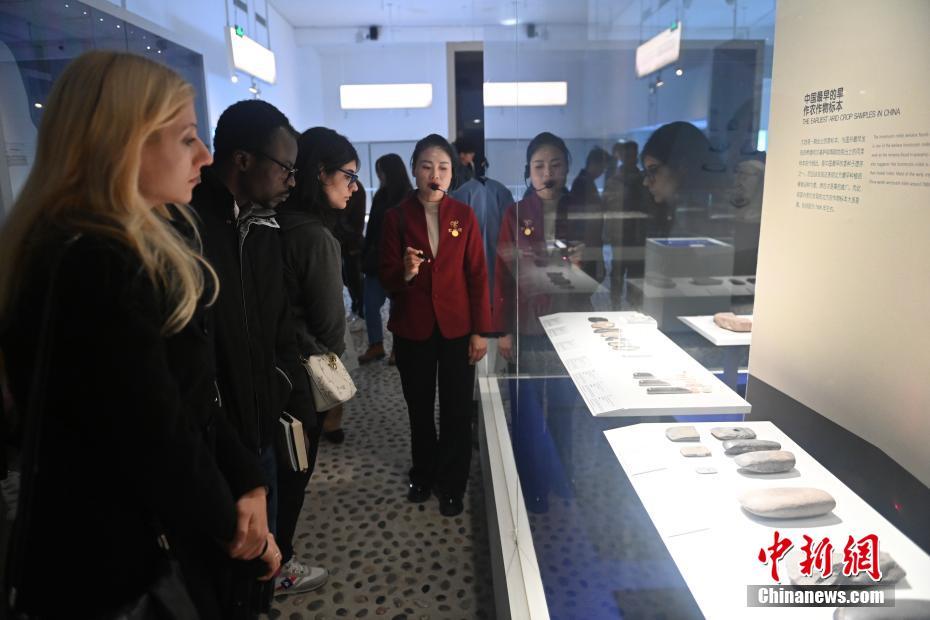 10月22日,2024青年漢學家研修計劃甘肅班團隊22個國家的青年漢學家,走進甘肅省天水市秦安縣大地灣遺址參觀并進行專題研修。大地灣遺址是新石器時代大型聚落遺址,出土了中國乃至世界上最早的彩陶文化、最早的文字符號、種植生產了中國第一批糧食品種黍、出現了最早的宮殿式建筑、發(fā)明了世界最早的水泥地面、創(chuàng)造了最早的繪畫作品——F411地畫。圖為22國青年漢學家參觀大地灣博物館。中新社記者 李亞龍 攝