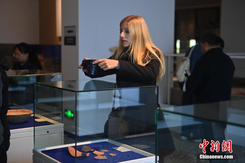 ?。保霸拢玻踩眨玻埃玻辞嗄隄h學家研修計劃甘肅班團隊22個國家的青年漢學家,走進甘肅省天水市秦安縣大地灣遺址參觀并進行專題研修。大地灣遺址是新石器時代大型聚落遺址,出土了中國乃至世界上最早的彩陶文化、最早的文字符號、種植生產了中國第一批糧食品種黍、出現了最早的宮殿式建筑、發(fā)明了世界最早的水泥地面、創(chuàng)造了最早的繪畫作品——F411地畫。圖為國外青年漢學家拍攝大地灣博物館藏品。中新社記者 李亞龍 攝
