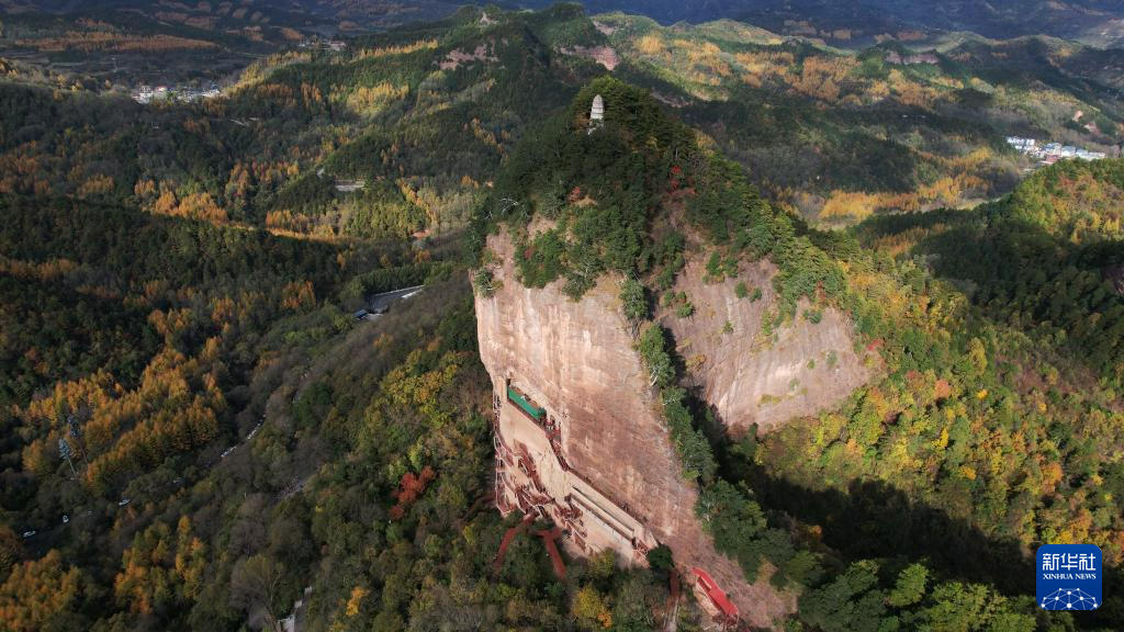 這是11月2日拍攝的麥積山石窟秋景(無人機照片)。新華社記者 郎兵兵 攝