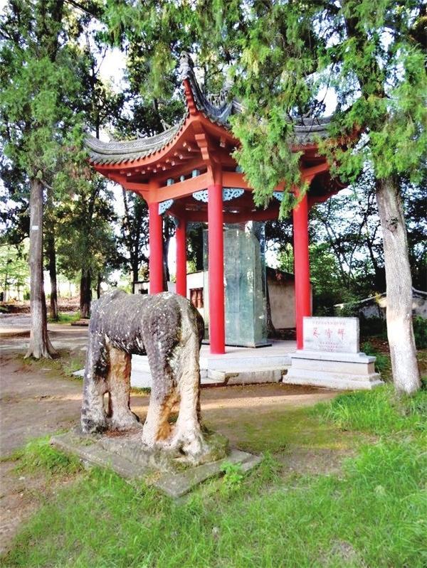 到達(dá)山頂?shù)膮谦d墓,眼前出現(xiàn)的是兩尊相向而立高大的宋代石人,石人的不遠(yuǎn)處是一對相互對望的石馬。在這兩匹宋代高大石馬的后面,是一個由六根朱紅色木柱擎起的六角亭。亭子里一塊石碑矗立其間,碑上刻著 “宋故開府吳公墓志銘”。