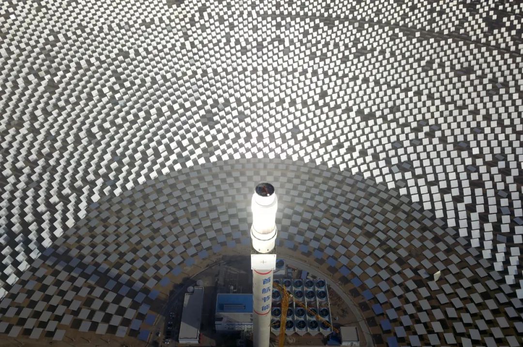 人們驚呼,這是自然力與人類智慧的完美創(chuàng)造:戈壁荒灘上“種”出了人造太陽。這個100兆瓦熔鹽塔式光熱電站,占地面積相當(dāng)于780個足球場,每年所生產(chǎn)的綠電可減排35萬噸二氧化碳。