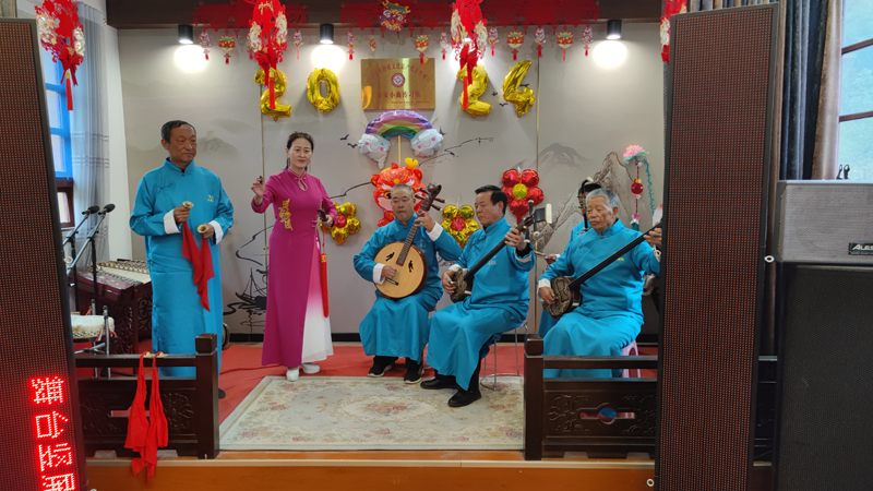 秦安縣集賢村文化活動(dòng)室內(nèi),集賢文藝劇社的社員們正在排練演唱新編秦安小曲。新華網(wǎng)發(fā)(郭林玉 攝)