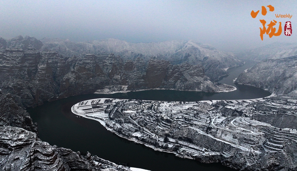 黃河水在峽谷中緩緩流淌,原本色彩斑斕的連綿群山,被皚皚白雪溫柔覆蓋,更顯層次,呈現(xiàn)出一幅壯美的山河畫(huà)卷。