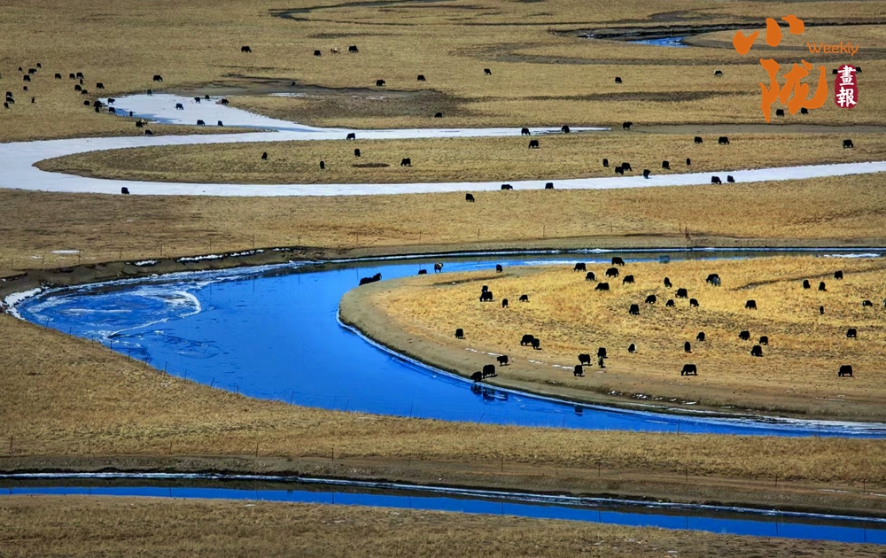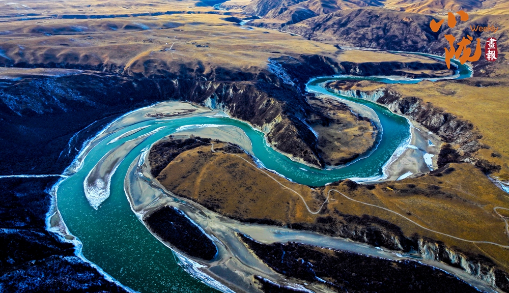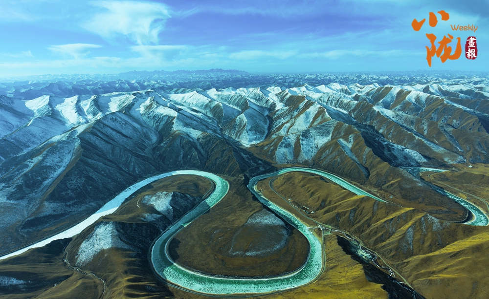 白雪皚皚的山梁、斗折蛇行的黃河,在陽光下閃耀著金色的光芒,顯得格外耀眼和溫暖。