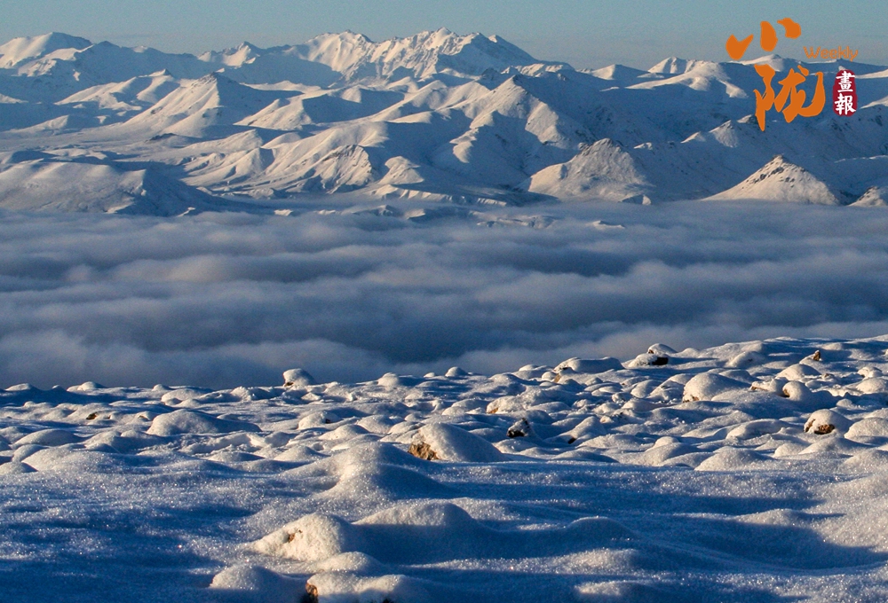 藍(lán)天如洗,鋪滿白雪的草原,與群山相映,蒼茫無(wú)際,呈現(xiàn)出安然素美的意境。