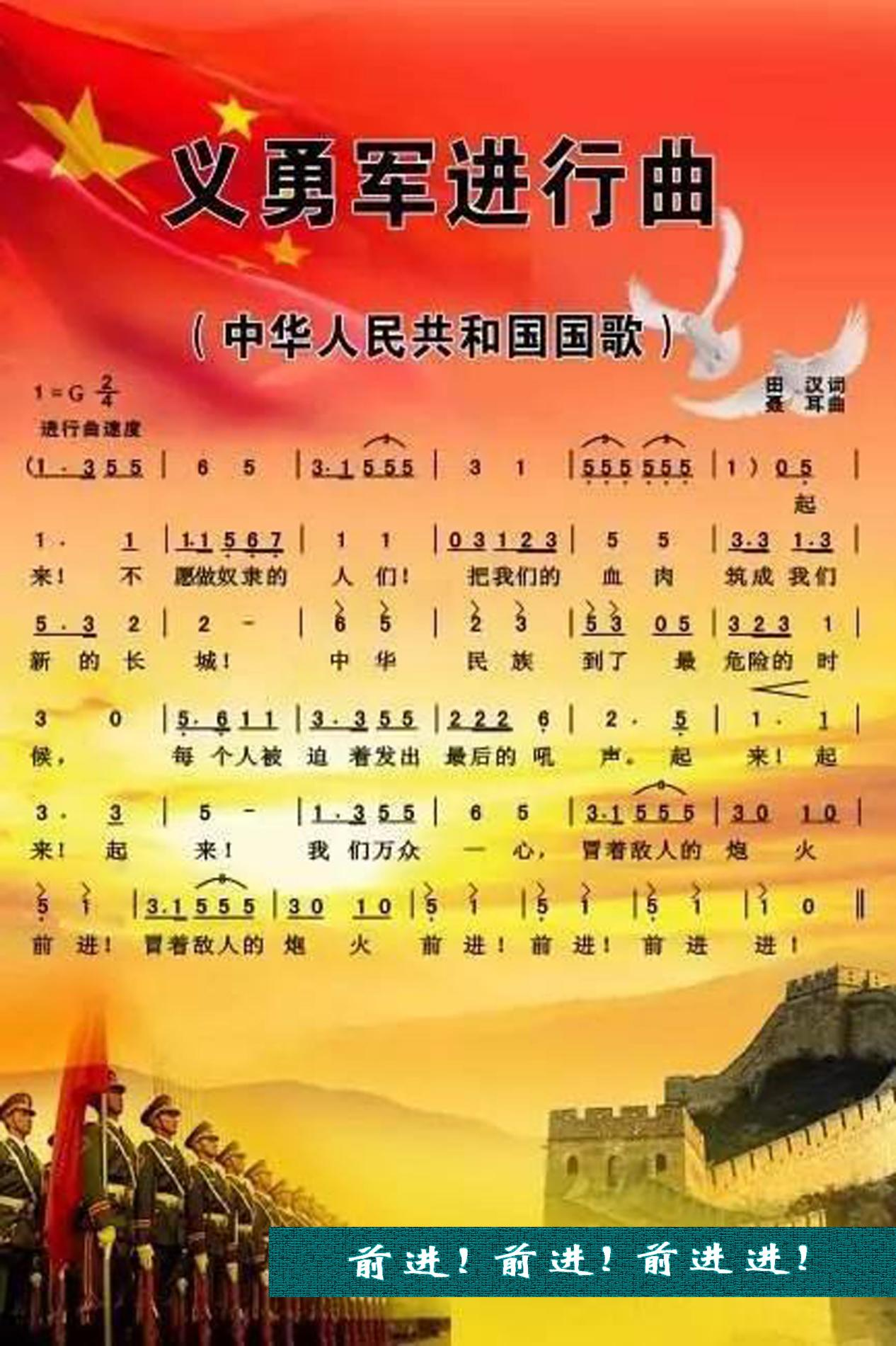 ⑧前進(jìn)!前進(jìn)!前進(jìn)進(jìn)?。骸读x勇軍進(jìn)行曲》這一段歌詞是作曲家聶耳改定的。為了使歌曲曲調(diào)和節(jié)奏更加有力,聶耳把田漢原來(lái)的“我們?nèi)f眾一心,冒著敵人的飛機(jī)大炮前進(jìn)。前進(jìn)!前進(jìn)!前進(jìn)!”改為“我們?nèi)f眾一心,冒著敵人的炮火,前進(jìn)!冒著敵人的炮火,前進(jìn)!前進(jìn)!前進(jìn)進(jìn)!”全國(guó)政協(xié)委員、國(guó)家一級(jí)指揮、解放軍軍樂(lè)團(tuán)前團(tuán)長(zhǎng)于海曾談到:“前進(jìn),前進(jìn),前進(jìn)進(jìn)!”這七個(gè)字堪稱(chēng)國(guó)歌的點(diǎn)睛之筆。“前進(jìn)進(jìn)”的節(jié)奏感,凸顯了國(guó)歌精神的進(jìn)行時(shí)態(tài)。正是這種精神一直在指引我們,激勵(lì)著我們。