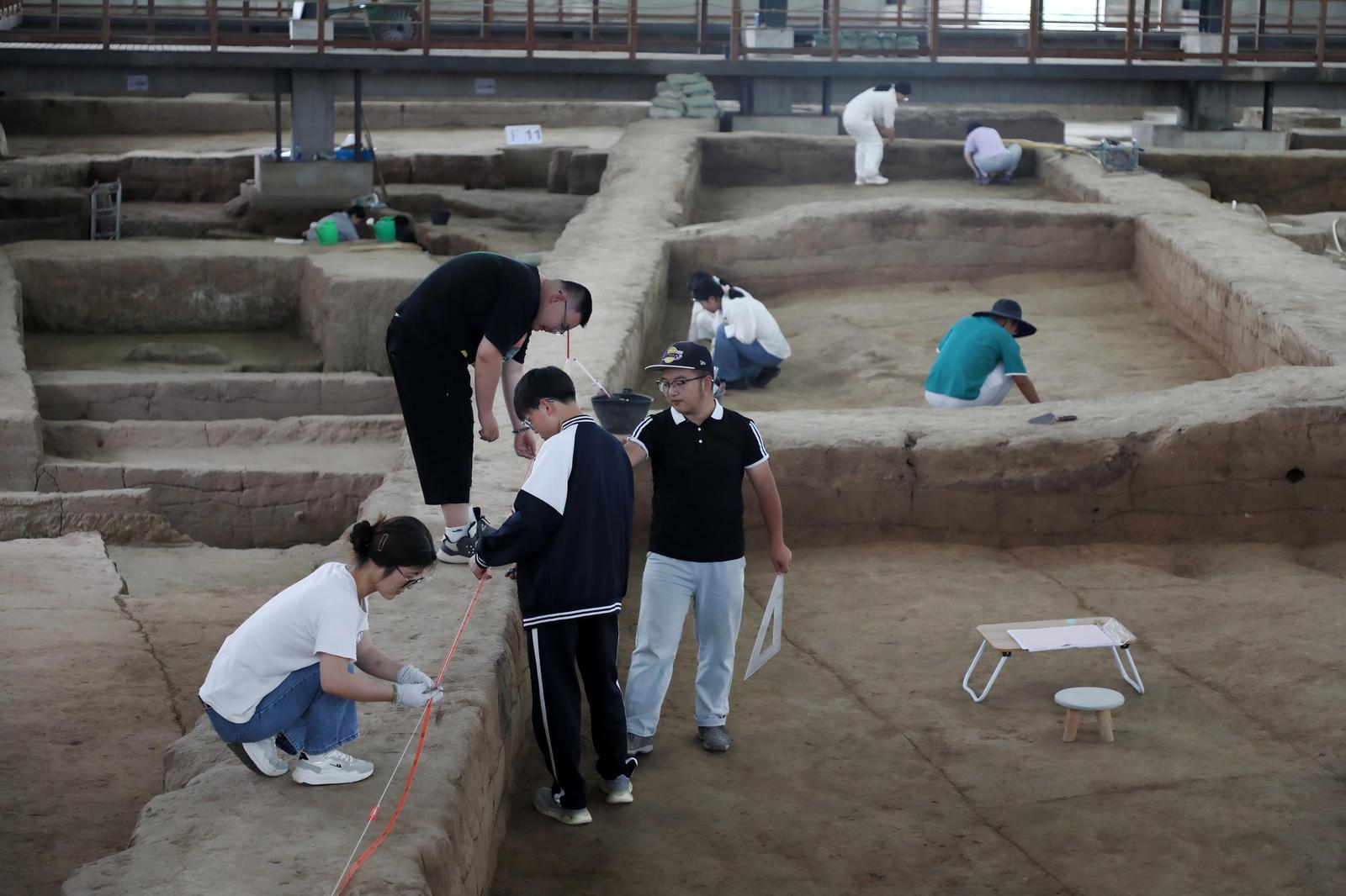 不遠處,另外幾名學生也在各自負責的探方內忙碌著,畫線、找邊、測量、繪圖,他們用手中的工具,在土層中探尋著慶陽文明脈搏的古老印記。