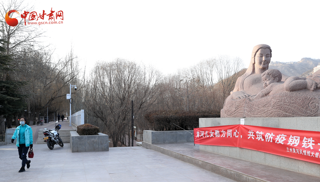 同樣,代表蘭州城市形象的黃河母親雕塑,也拉起了一條紅色橫幅,上面寫著“黃河兒女勠力同心,共筑防疫鋼鐵長城。”