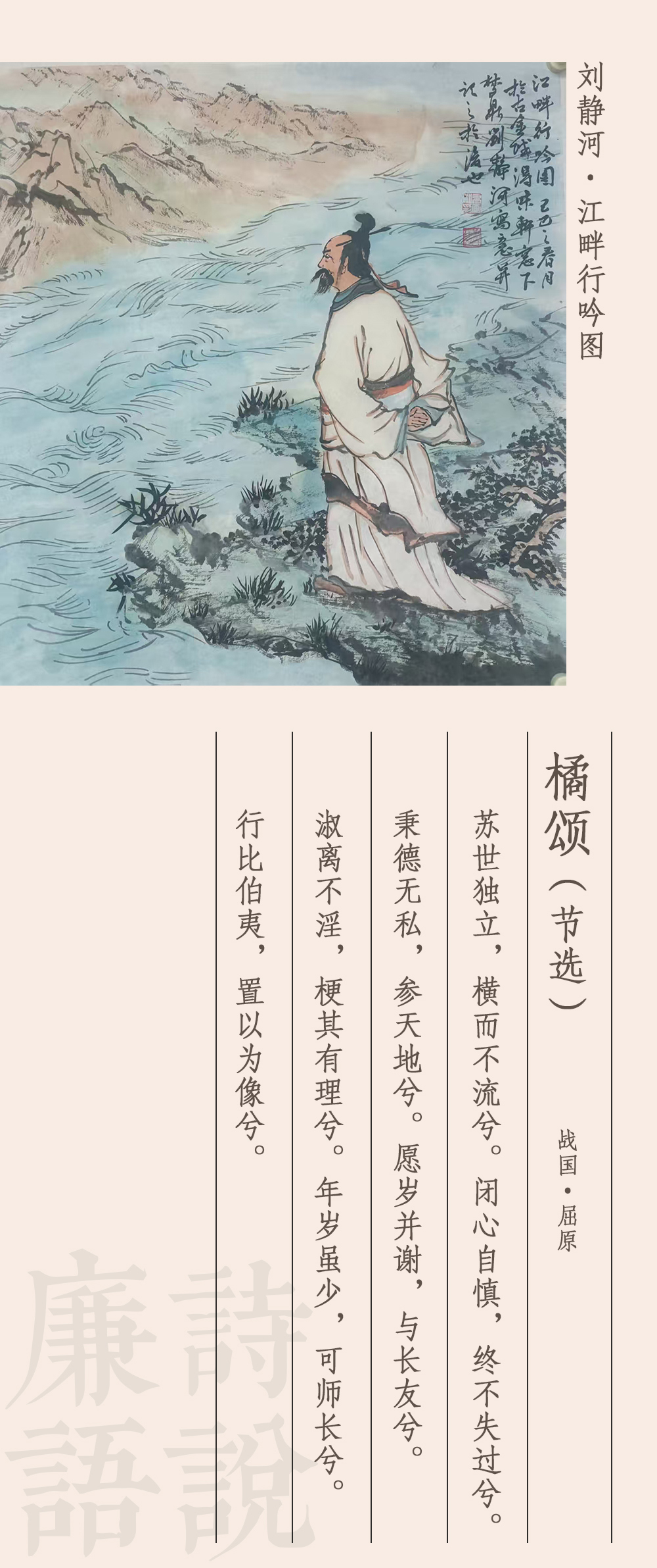 《橘頌》被譽為中國最早的詠物詩。據考證,屈原在流放之初,苦悶憤激,看到南國的橘樹,心有所觸,將橘樹人格化,賦予其君子仁人的品格,寫下了這首詩。詩分兩部分,前半部分寫實,刻畫了橘樹的生長習性和枝葉花果,后半部分抒情議論,托物言志,橘人合一,情景交融。這里節(jié)選了后半部分,大意如下:清醒立世啊不隨波逐流,小心謹慎啊過失從不留,沒有私欲啊與天地比儔,我與你同生死啊永結為好友,你形象美好啊耿直作一流,你風華正茂啊堪為好師長,你高潔比伯夷啊榜樣最優(yōu)秀。