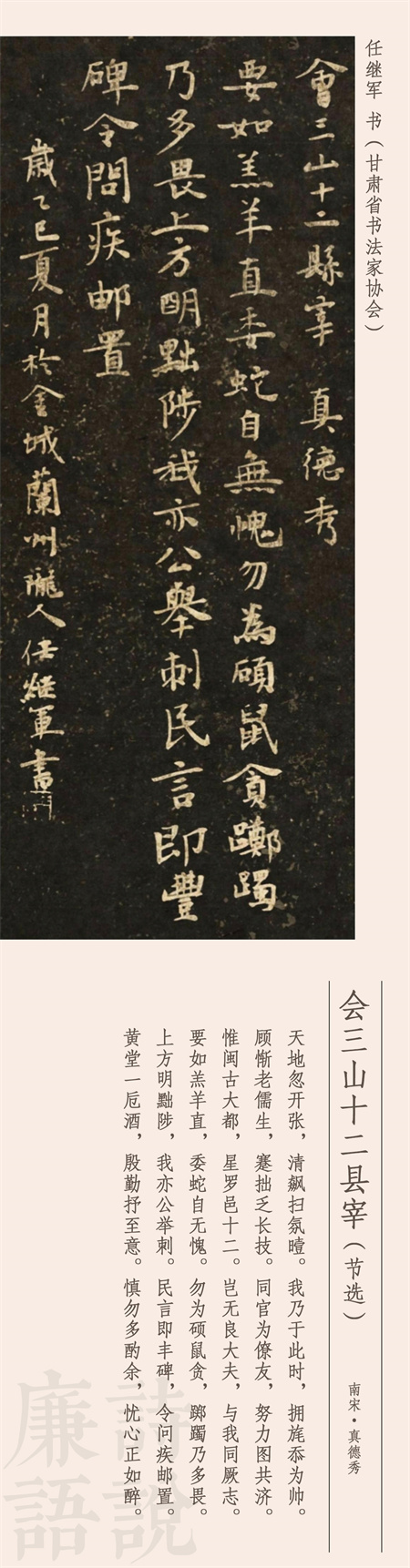 公元1232年,南宋官員真德秀到福州擔(dān)任知府,到任后把下轄12個(gè)縣的知縣召集在一起集體談話,擺事實(shí)、講道理,談廉政、申紀(jì)律,事后將談話內(nèi)容寫(xiě)成了詩(shī),就是今天我們看到的這首作品。這是一首五言敘事詩(shī),長(zhǎng)達(dá)250字,這里我們節(jié)選后半部分。