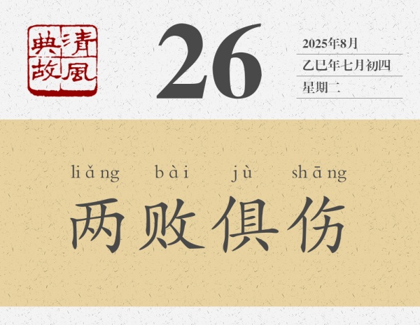 講完這個故事,陳軫言歸正傳,對秦惠王說:“今韓魏相攻,期年不解,是必大國傷,小國亡,從傷而伐之,一舉必有兩實。此猶莊子刺虎之類也。”秦惠王聽從了陳軫的建議,后來“大國果傷,小國亡,秦興兵而伐,大克之”。后世即以“兩敗俱傷”為典,比喻爭斗雙方都會受到損失,誰也得不到好處,也用來形容毫無意義的爭斗?!缎挛宕?bull;宦者傳論》:“雖有圣智,不能與謀。謀之而不可為,為之而不可成。至其甚,則俱傷而兩敗。”
