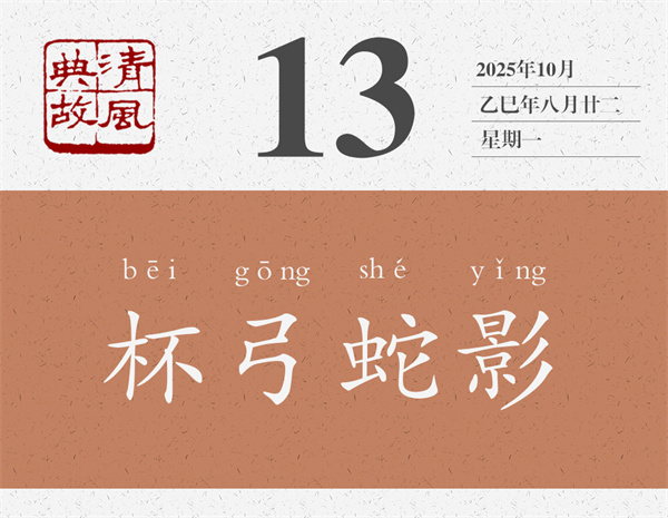 樂廣想,哪有這回事呢?當(dāng)時(shí),河南聽事堂墻壁上掛著一張弓,上面用漆畫著一條蛇。樂廣就想,這位朋友所見杯中之蛇,是不是這張弓的影子呢?于是,復(fù)原了上次喝酒的現(xiàn)場(chǎng),讓客人坐在原來的位置上,將酒杯放在原來的地方上,問他“酒中復(fù)有所見不”,客人說“所見如初”。樂廣這才告訴他,杯中之蛇只是角弓之影而已。客人于是“豁然意解,沉疴頓愈”。后世即以“杯弓蛇影”為典,比喻疑神疑鬼,自相驚擾。明人袁宏道詩《病中和黃道元至日禪寺夢(mèng)悉詩》:“消愁莫問弓蛇影,對(duì)境聊觀夢(mèng)幻身。”