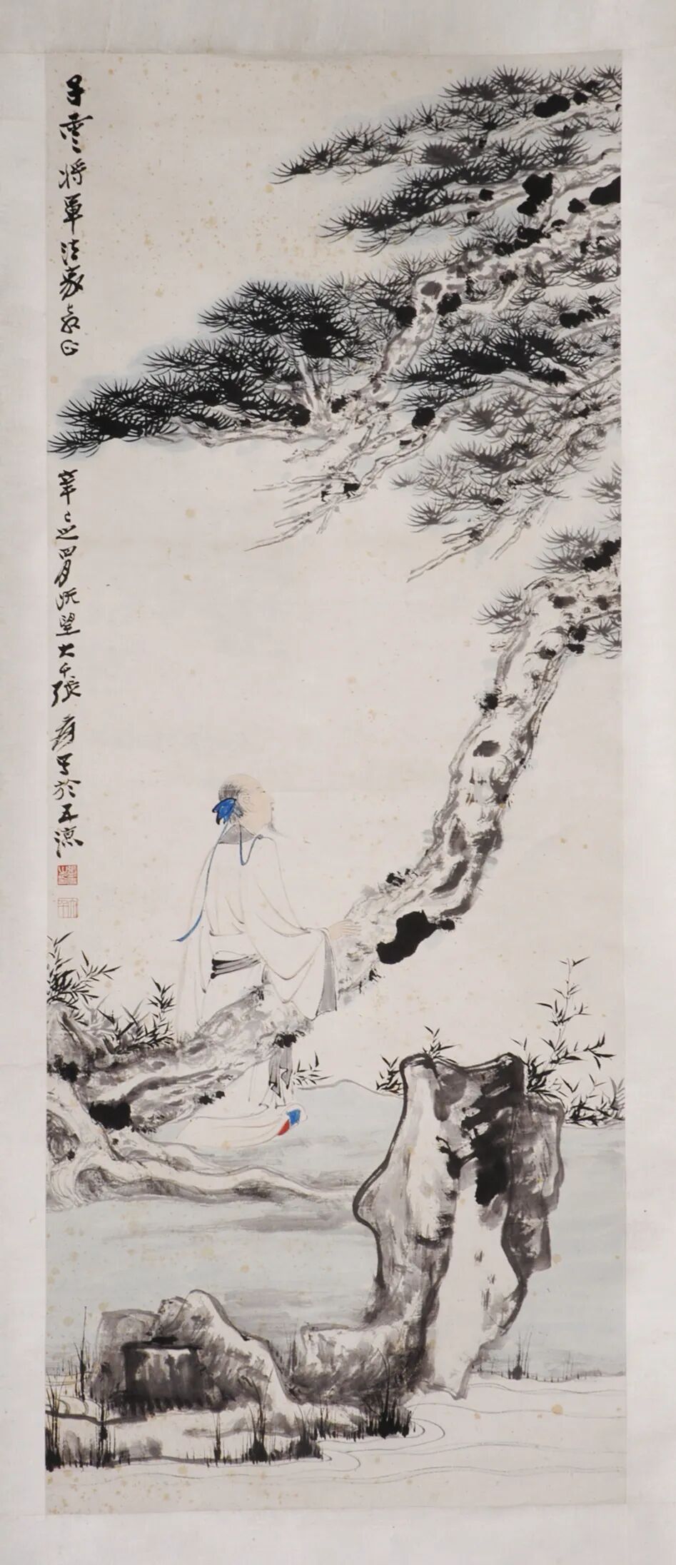 這幅作品在構(gòu)圖、筆墨、設(shè)色等方面都展現(xiàn)了極高造詣。畫面采用經(jīng)典的“S”形構(gòu)圖,古松自左下方向右上方蜿蜒伸展,形成強烈的動勢與韻律感。松樹以“釘頭鼠尾”描法勾勒,筆觸蘊含書法韻律:起筆如楷書之頓挫,行筆如草書之流暢,收筆若隸書之含蓄。這種源自陳洪綬而自出新意的筆法,既表現(xiàn)松樹的蒼勁質(zhì)感,又暗合中國書法力透紙背的審美要求。設(shè)色上通過淡墨層層渲染,營造“素以為絢”的審美境界。畫面以水墨為主調(diào),僅在高士衣襟處施以淡赭石,松針間點綴少許石綠。這種惜色如金的處理方式,既保持文人畫“淡而不厭”的審美特質(zhì),又通過微妙色彩對比增強藝術(shù)感染力。