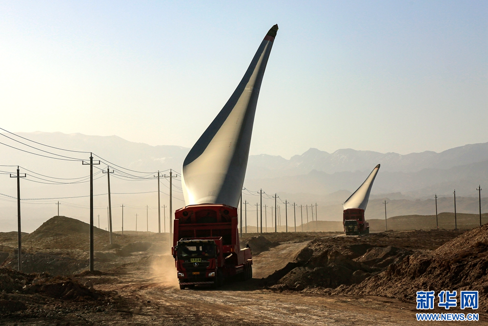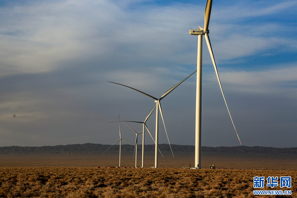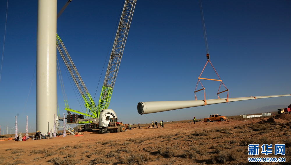 近日,在甘肅省張掖市甘州區(qū)平山湖20千瓦風電施工現(xiàn)場,工人們緊張有序地進行風電設(shè)備安裝工作。新華網(wǎng)發(fā)(陳禮 攝)