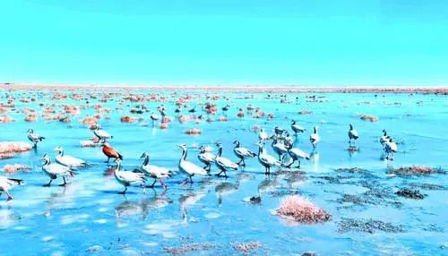 天氣晴朗時,佇立湖邊的山崗上俯瞰湖心,好似一塊無瑕的翡翠。如果你來到這里,可飽覽遠處草原的天空深邃如井,云如裙裾;近處的湖面上,鳥飛魚躍,這些美景定會讓你流連忘返。
