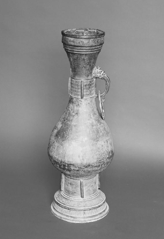 明獸面銜環(huán)耳銅瓶:該銅瓶古樸修長(zhǎng)、厚重。銅瓶為一對(duì),形制及紋飾相同,高0.9米,口徑0.19米,重43.86千克。直口,外卷方唇,束長(zhǎng)頸,對(duì)稱置獨(dú)角獸吐舌形半環(huán)耳,下帶小珥,耳套如意形環(huán),垂膽形腹,束高脛,下為折肩形圈足,足口外撇,無(wú)底??谘叵嘛椚腊枷壹y,頸部飾四個(gè)等分菲棱,間以雷地紋,脛部飾四菲棱間以鱗形波浪紋,圈足飾菲棱形回紋。銅瓶原存放于崆峒山太和宮真武殿真武像前,置于韓王鼎左右。