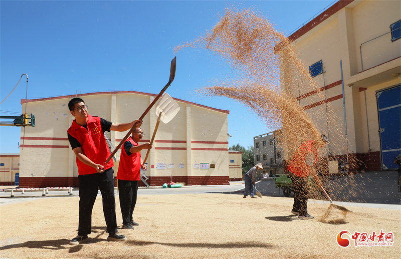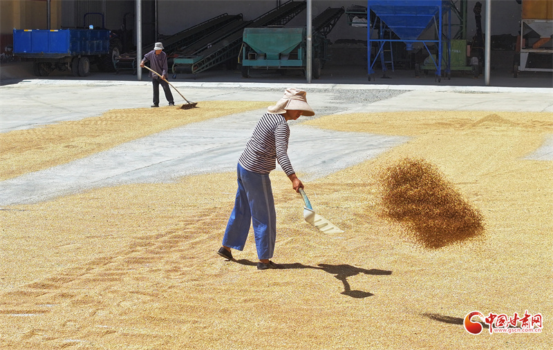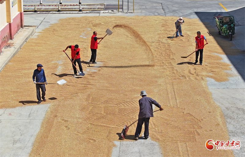 8月19日,在民樂縣糧食產(chǎn)后服務(wù)中心的曬場(chǎng)上,糧農(nóng)們正在搶抓晴好天氣翻曬小麥。