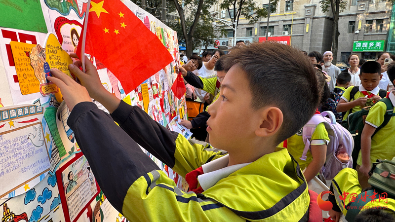 早上八點,孩子們手執(zhí)鮮艷的國旗,踏著《歌唱祖國》《我們是共產(chǎn)主義接班人》的歌聲步入校園。在校門口設(shè)立的“我與先輩的時空對話”打卡墻成為情感表達(dá)的窗口,孩子們用真摯的語言寫下對先輩的崇敬與承諾:“我們會讓祖國更強大”“我們會像愛護(hù)紅領(lǐng)巾一樣愛護(hù)祖國”。一字一句,跨越時空,傳遞著少年對歷史的回應(yīng)和對未來的擔(dān)當(dāng)。