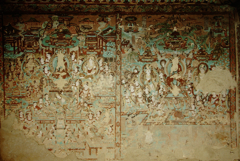 畫面中的人物造型嚴(yán)格遵循唐代仕女的畫風(fēng)繪制,顯得豐腴飽滿,恰似盛唐時(shí)期雍容華貴的氣質(zhì)寫照。線描寫實(shí)明快,流暢飛動(dòng),一氣呵成,仿佛是畫師用靈動(dòng)的筆觸在墻壁上勾勒出的生命樂章。畫面的顏色以石綠、赭黃、鉛白為主色。整個(gè)畫面顯得典雅、嫵媚,令人賞心悅目。雖然伎樂天頭部原本貼金的頭飾已經(jīng)剝落,但歲月的痕跡并未減損她雍容華貴的氣質(zhì),反而更增添了一份歷史的厚重感。