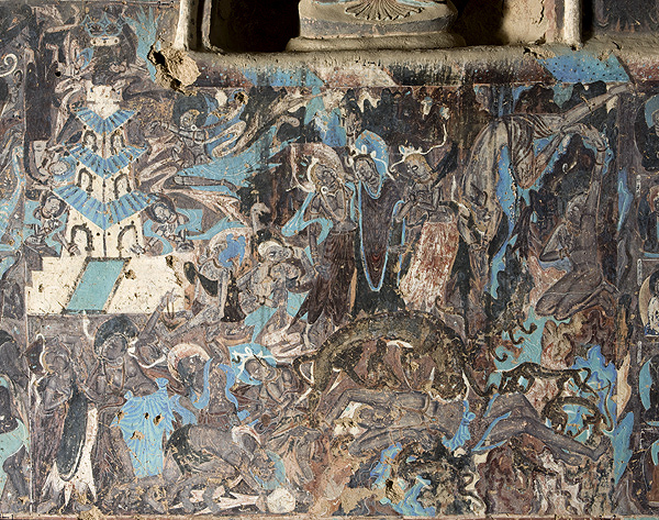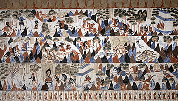 作為莫高窟北周壁畫的代表作,第428窟《薩埵太子本生》突破了傳統單幅畫面的局限,以三層長卷分欄鋪陳。畫師巧妙運用群山作為情節(jié)分隔,既保持畫面獨立性,又通過蜿蜒的“S”形布局引導觀者視線自然流轉。