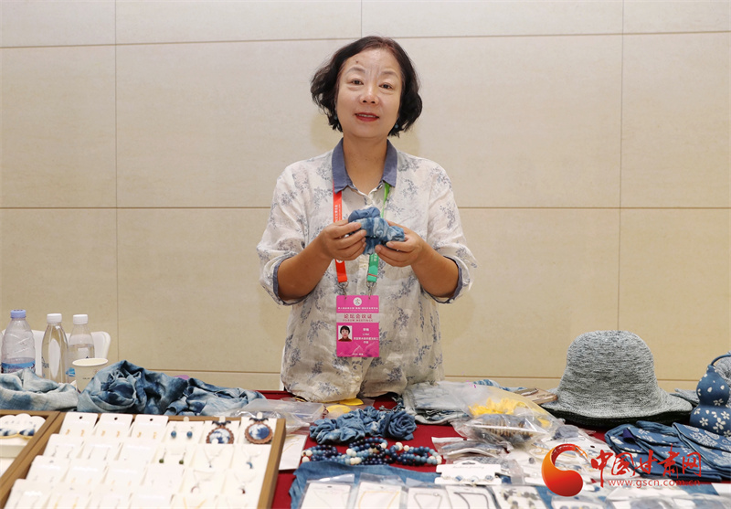 在第八屆進博會的現(xiàn)場,甘肅館以其獨特的人文底蘊吸引了眾多目光。展館內(nèi),弧形山脈造型的背景,仿佛展現(xiàn)著甘肅的壯美風光,而慶陽香包、敦煌絲巾等精美展品,則如璀璨明珠,訴說著甘肅的文化魅力。就在這其中,來自平?jīng)龅墓欧ㄋ{染技藝展臺格外引人注目,一件件藍染作品散發(fā)著獨特的草本氣息,向世界展示著非遺的獨特魅力,而這些作品的創(chuàng)作者,正是平?jīng)鏊{染技藝的市級非遺傳承人李梅。