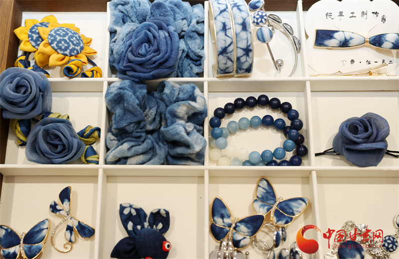 染好的布匹還要經(jīng)過脫漿、清洗、陰干,最后才是拆線、整理。當一塊完整的藍印花布展現(xiàn)在眼前時,李梅總會輕輕撫摸布料,仿佛在與草木對話。她的工作室里,掛滿了用藍染制成的物件:桌布上印著成片的板藍根葉,茶席邊緣綴著小巧的藍染布扣,就連她日常穿的棉麻衫,也是自己染的淡藍色。“這些布不是冰冷的商品,是帶著土地溫度的生活。”李梅說,去年她在平?jīng)龉懦情_了一間“藍染生活館”,游客可以跟著她學種板藍根、體驗扎染,很多人第一次發(fā)現(xiàn),原來衣服上的藍色可以來自田野,非遺技藝能如此貼近日常。
