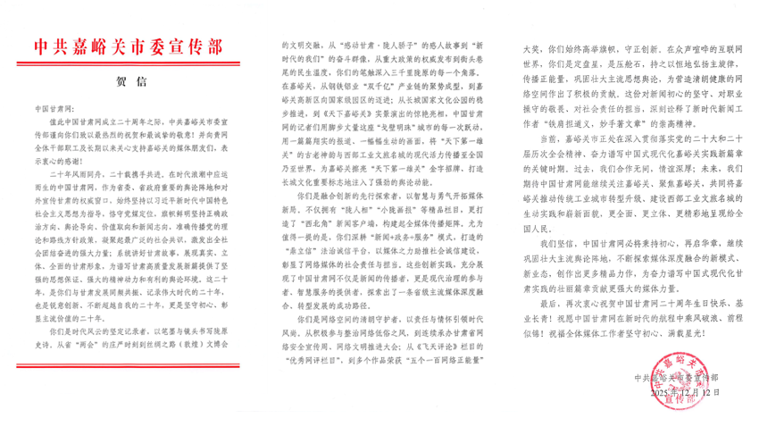 中國甘肅網(wǎng)12月12日訊(西北角·中國甘肅網(wǎng)記者 宋芳科)值中國甘肅網(wǎng)成立二十周年之際,中共嘉峪關(guān)市委宣傳部特向中國甘肅網(wǎng)發(fā)出賀函,致以最熱烈的祝賀與最誠摯的敬意,高度肯定二十年來中國甘肅網(wǎng)為嘉峪關(guān)新聞宣傳事業(yè)、輿論引導(dǎo)工作作出的重要貢獻(xiàn),并對(duì)長期以來的支持表示衷心感謝。