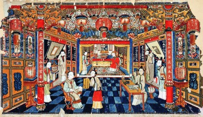整幅年畫(huà)為我們呈現(xiàn)了一個(gè)處處燈光相映、人人語(yǔ)笑喧闐的祥和景象。畫(huà)中人物采用中國(guó)繪畫(huà)技法,線描敷色均呈現(xiàn)平面化特征,而居室空間則采用在清代稱為“線法畫(huà)”的技法,借鑒西方焦點(diǎn)透視法,使畫(huà)面產(chǎn)生立體感,將觀者的目光緩緩引入熱鬧溫馨的場(chǎng)景之中。