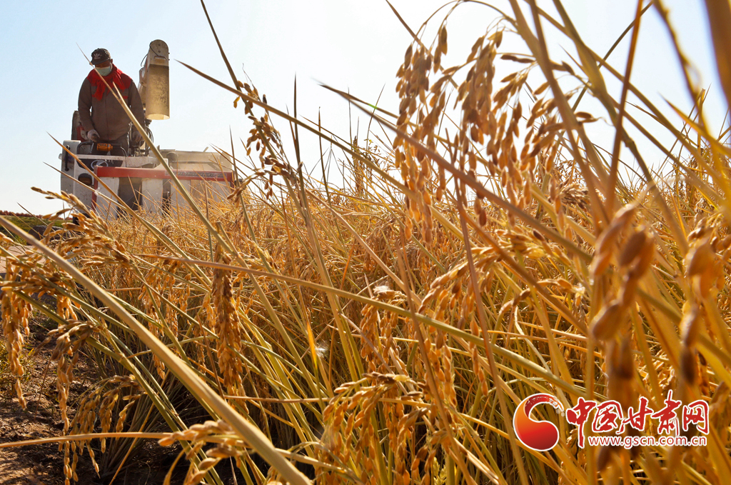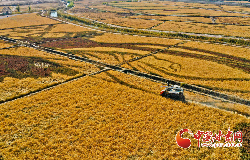 10月21日,位于祁連山下的甘肅省張掖市甘州區(qū)烏江鎮(zhèn)新河田園綜合體內(nèi),農(nóng)戶們正在收割成熟的高原水稻。