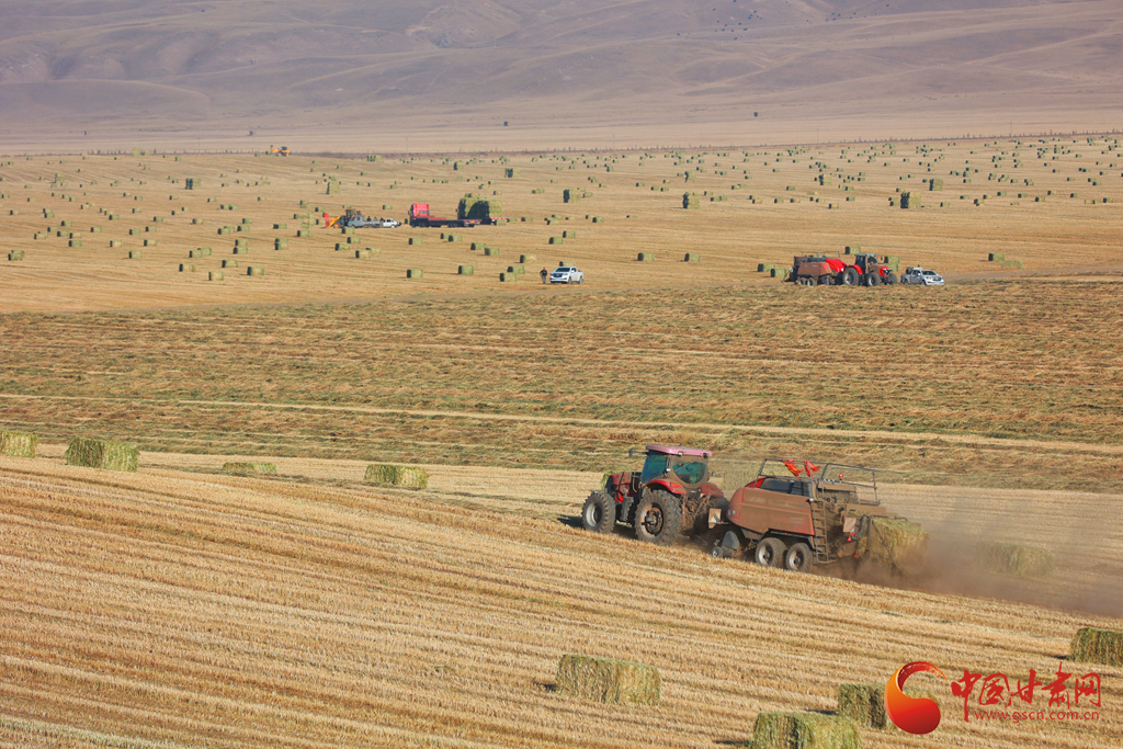 11月9日,甘肅山丹馬場(chǎng)正在對(duì)此前收割晾曬的21萬(wàn)畝燕麥草打包運(yùn)輸,一輛輛大型農(nóng)用機(jī)械穿梭田間忙碌作業(yè)。