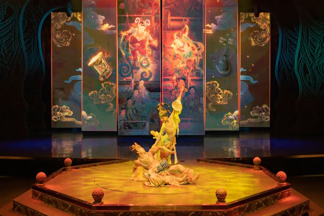 劇中運(yùn)用了五弦琵琶、排簫等民族樂(lè)器及敦煌仿制樂(lè)器,演繹了胡旋舞、琵琶舞等敦煌舞蹈,配合取材自敦煌古樂(lè)譜和西域曲調(diào)的劇目樂(lè)曲,還原了敦煌壁畫中的樂(lè)舞盛景。在演出模式上,《樂(lè)動(dòng)敦煌》打破了人和舞臺(tái)間的界限,讓觀眾置身劇場(chǎng),近距離感受敦煌傳承千年的古樂(lè)文化魅力。