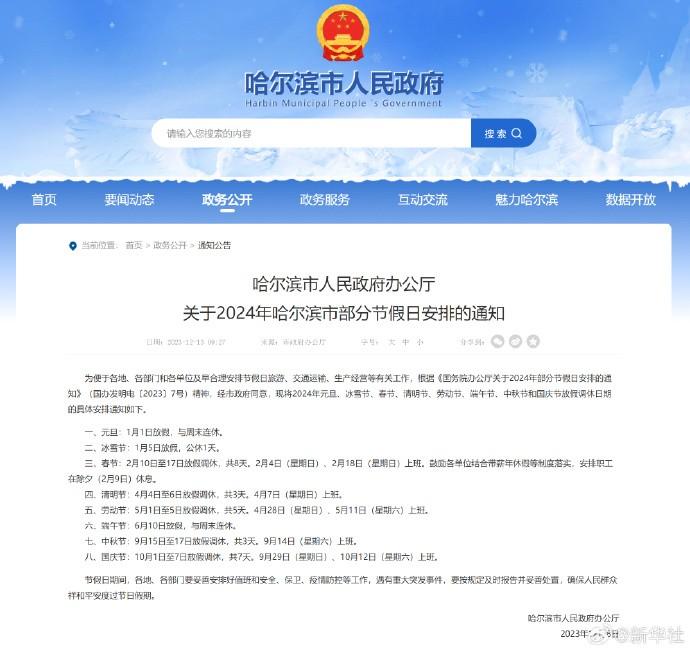1月5日對哈爾濱人來說是一個特別的假期。據(jù)《哈爾濱市人民政府辦公廳關(guān)于2024年哈爾濱市部分節(jié)假日安排的通知》,冰雪節(jié)2024年1月5日(星期五)公休1天。明天,第40屆中國·哈爾濱國際冰雪節(jié)將盛大啟幕。