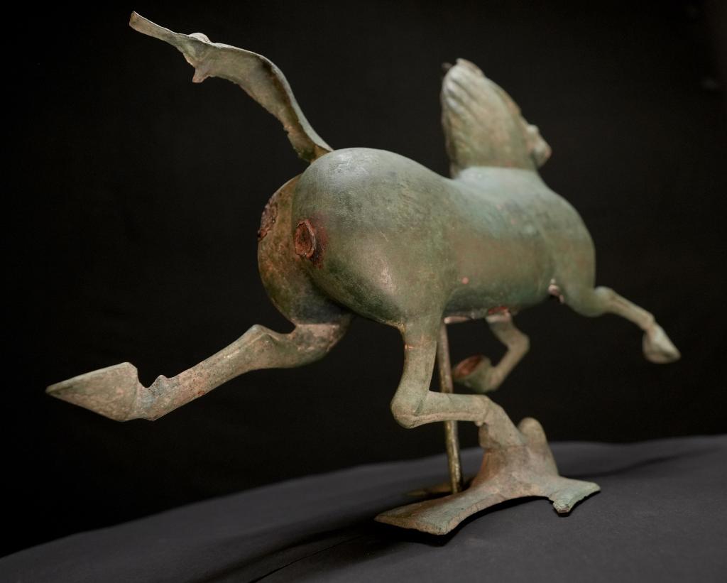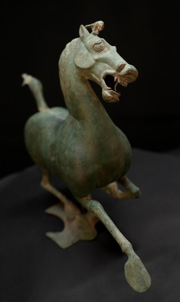 馬兒如在空中飛馳,一足踏上飛鳥的剎那,飛鳥回首驚顧。細(xì)細(xì)觀之,馬的口、眼、鼻均張開,鬃毛和尾絲后揚(yáng),令人仿若聽見馬兒奔騰的嘶鳴和風(fēng)嘯聲,靜態(tài)的青銅器充滿靈動(dòng)之感。