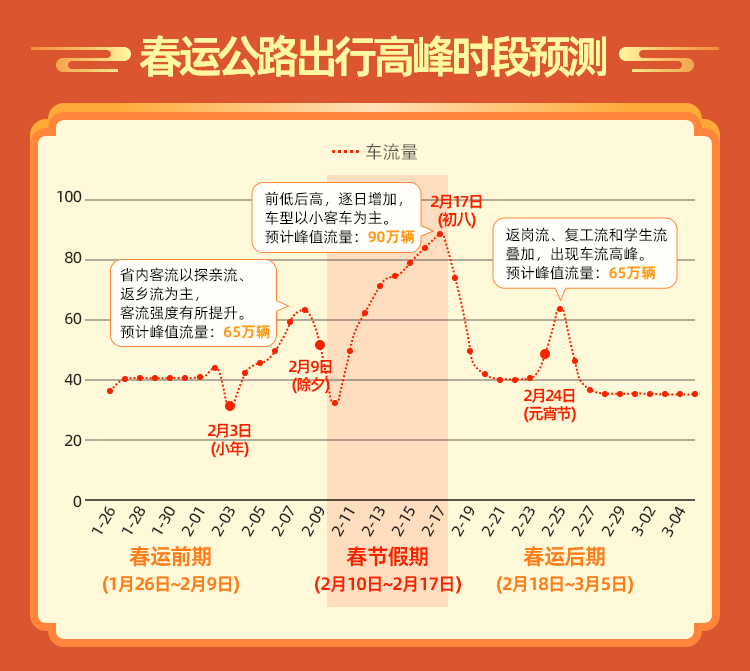 春運前期(1月26日至2月9日):省內客流以隴南、天水、嘉峪關、武威、平涼等方向的探親流、返鄉(xiāng)流為主,客流強度有所提升,跨省客流以出疆途經甘肅返回內地的返鄉(xiāng)流為主,出現(xiàn)節(jié)前自西向東的潮汐現(xiàn)象。預計2月8日(臘月二十九)國省道路交通流量較大,公眾出行迎來集中高峰。此外,受群眾采辦年貨、休閑逛街、中短途探親訪友以及大型活動等多種因素影響,各市城區(qū)貨物市場、繁華商圈等周邊區(qū)域以及部分主干道路,將出現(xiàn)一定的交通壓力。