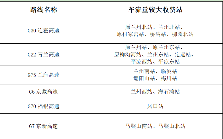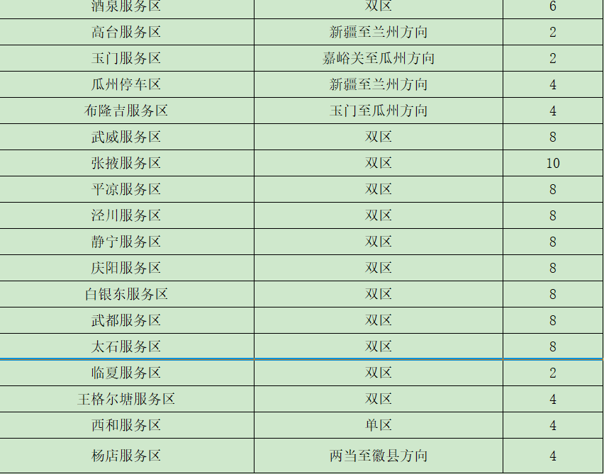 (二)重點客運車站班線。省內二級及以上客運站正常營運,以省會城市、人口密集市縣的站點及之間的班線為重點。如:蘭州客運東站、南站,天水汽車站等站點以及蘭州—定西、蘭州—西峰、臨洮—平川、舟曲—武都、金昌—武威等客運班線。 (三)車流量較大服務區(qū)。預計我省車流量較大服務區(qū)為定西服務區(qū)、酒泉服務區(qū)、武威服務區(qū)、高臺服務區(qū)、長城驛服務區(qū)、靜寧服務區(qū)、會寧服務區(qū)、太石服務區(qū)、蘭州北服務區(qū)、接駕嘴服務區(qū)、永登服務區(qū)。