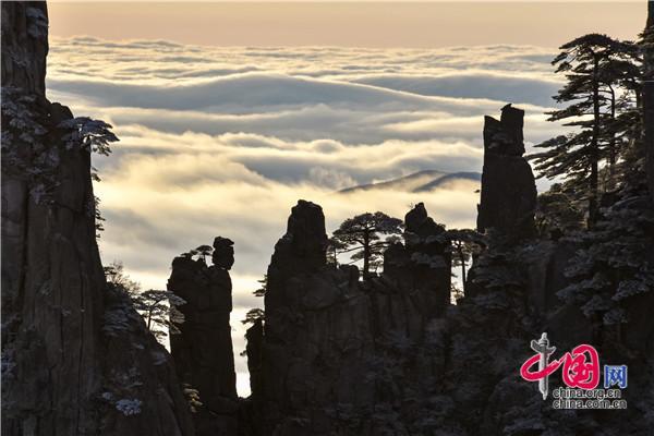 冬天的黃山絕美之處莫不過(guò)于雪景、霧凇、日出、云海同時(shí)出現(xiàn),1月5日雪后早晨一輪紅日冉冉升起,在陽(yáng)光的照耀下,放射出萬(wàn)丈光芒,在群峰間、奇松怪石上散發(fā)著金燦燦的光彩,給冬景增添神奇的色彩,美輪美奐宛如油畫(huà)。