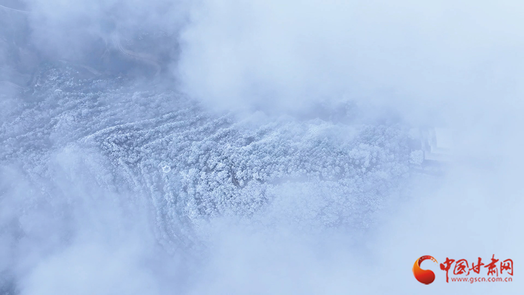 從高空俯瞰,云海之中霧凇景觀蔚為壯觀,連綿起伏的山巒美如仙境。縹緲的云霧似輕紗流淌涌動,漫過靜謐的山林,好似一幅如夢似幻的水墨畫卷。