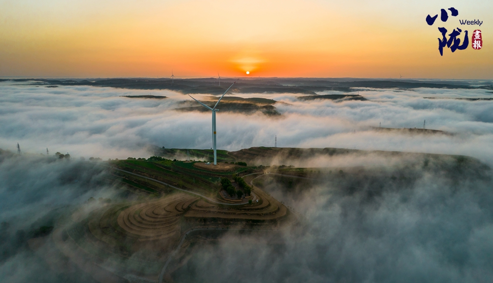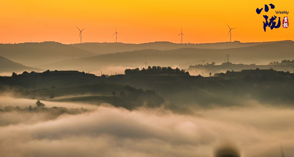 云霧如海浪般向四周漫延,呈現(xiàn)出別樣的霧海景觀,聳立在山川梁峁間的風力發(fā)電機隨風律動,成為當?shù)匾坏廓毺氐娘L景。