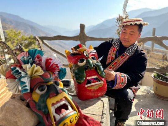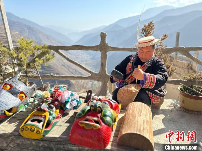 雕刻、打磨、上色……甘肅隴南市文縣鐵樓藏族鄉(xiāng)強(qiáng)曲村,白馬人薛剛一家四代人都精于木工。日前中新網(wǎng)記者走訪村子時(shí),薛剛坐在自家院子里,伏案制作池哥晝所用面具。池哥晝是白馬人保留最完整、最具特色民族舞蹈,面具是重要道具之一。薛剛制作的面具不僅用于周邊村子的池哥晝中,而且被廣州、上海等地的客商購買收藏。他時(shí)常將自己的想象融入面具中,用心打磨使其更具“靈氣”。他說,白馬人中從事面具雕刻的手藝人不多,最近他物色了一個(gè)“00后”徒弟,對(duì)方興趣濃厚,希望將這門手藝保護(hù)傳承好。圖為薛剛在院子里雕刻面具。閆姣 攝