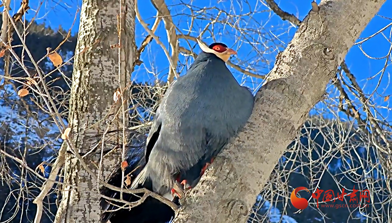 巡護(hù)員用鏡頭記錄下畫(huà)面,二十余只藍(lán)馬雞宛如冰雪精靈,在銀裝素裹的喬木林間愜意“聚會(huì)”。三五成群的藍(lán)馬雞用強(qiáng)健有力的爪喙翻動(dòng)雪層,精準(zhǔn)定位埋藏的草籽,專(zhuān)心干飯。距地面十余米的楊樹(shù)上,擔(dān)任警戒的“哨兵”不時(shí)發(fā)出低沉的咕嚕聲,蓬松的尾羽在陽(yáng)光下流轉(zhuǎn)著金屬般的光澤。最引人注目的當(dāng)數(shù)林間空地上的“時(shí)裝秀”了,“模特”們輪流抖動(dòng)藍(lán)黑漸變的羽毛,頸后白色耳羽簇如流蘇輕顫,精彩的表演折服了五位“評(píng)委”,它們個(gè)個(gè)目不轉(zhuǎn)睛,生怕漏掉每一個(gè)演出細(xì)節(jié)。這場(chǎng)持續(xù)數(shù)小時(shí)的藍(lán)馬雞“聚會(huì)”也為祁連山國(guó)家公園生態(tài)系統(tǒng)健康運(yùn)轉(zhuǎn)做出了生動(dòng)注腳。