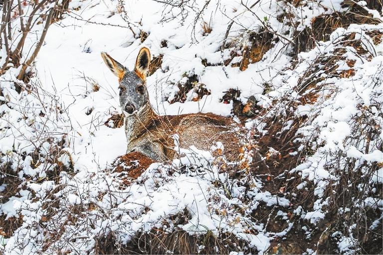 攝影師鏡頭下,一只馬麝安然臥在雪地上,它的耳朵偶爾會(huì)輕輕抖動(dòng)一下,像是在用心傾聽著風(fēng)中傳來(lái)的細(xì)微聲響。它優(yōu)美的身形與周圍的景色完美融合在一起,寧?kù)o而祥和。