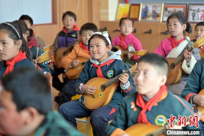中新社記者近日探訪瑪曲縣寄宿制藏族小學(xué)彈唱社團(tuán)活動(dòng),未進(jìn)教室,已聽到室內(nèi)傳出的歡快琴聲和笑聲。
