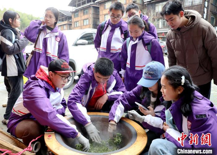 3月15日至16日,廣西柳州市一所中學(xué)組織千人研學(xué)團(tuán)到三江侗族自治縣八江鎮(zhèn)布央村仙人山景區(qū)開展茶文化研學(xué)活動(dòng),沉浸式采春茶、炒春茶、品春茶,深入了解茶種植、茶制作、茶文化、茶品鑒等知識(shí),進(jìn)一步培養(yǎng)實(shí)踐能力、提高勞動(dòng)素養(yǎng)。圖為研學(xué)活動(dòng)現(xiàn)場。龔普康 攝